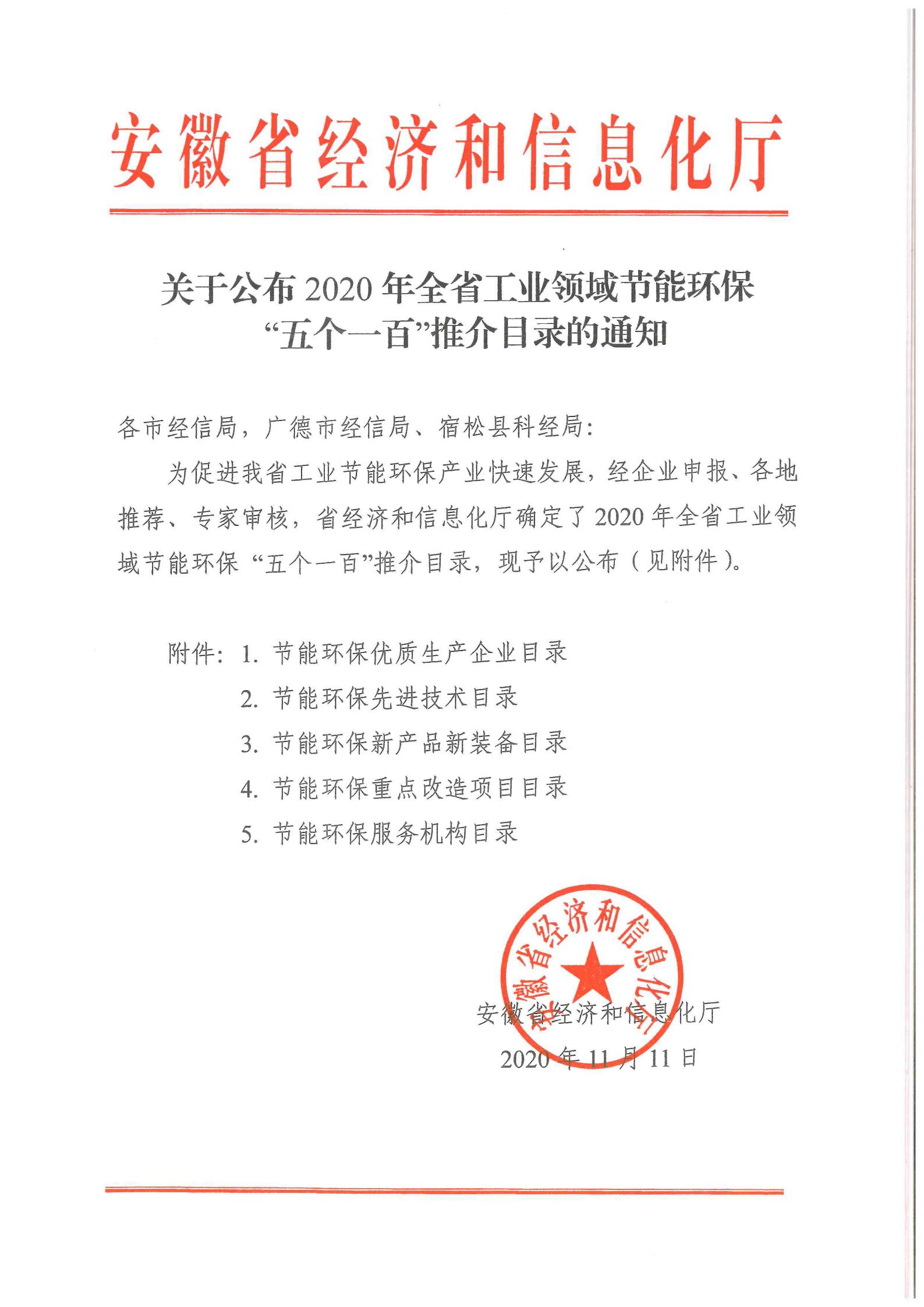 2020年11月11日,安徽省經(jīng)信委發(fā)布2020年度全省工業(yè)領(lǐng)域節(jié)能環(huán)保產(chǎn)業(yè)“五個一百”推介目錄。