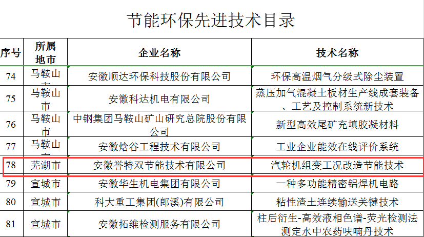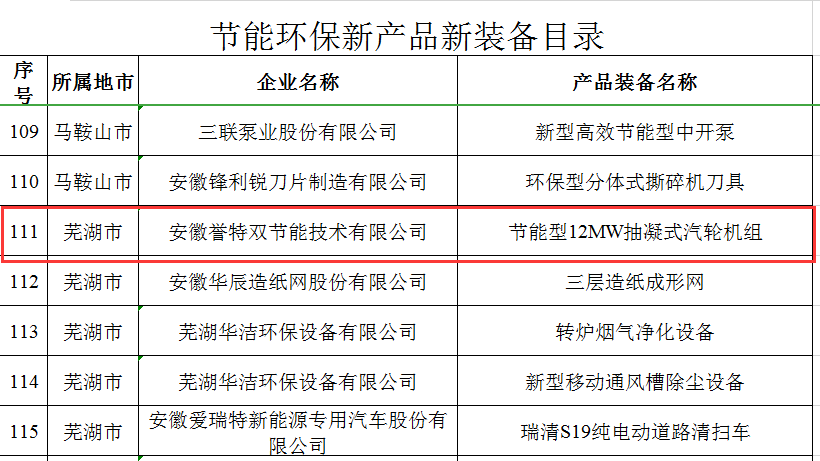 我公司“安徽譽特雙節(jié)能技術(shù)有限公司”入選“節(jié)能環(huán)保服務(wù)機(jī)構(gòu)目錄、核心產(chǎn)品“節(jié)能型12MW抽凝式汽輪機(jī)組”入選節(jié)能環(huán)保新產(chǎn)品新裝備目錄、核心技術(shù)“汽輪機(jī)組變工況改造節(jié)能技術(shù)”入選節(jié)能環(huán)保先進(jìn)技術(shù)目錄,此次入選,為公司連續(xù)四年入選。