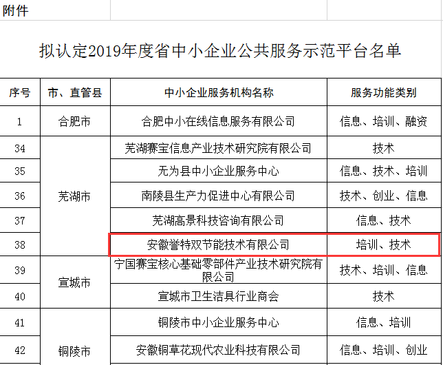 12月30日,我公司經(jīng)安徽省經(jīng)信廳認定為2019年度省中小企業(yè)公共服務示范平臺,本次全省共計評選出54家中小企業(yè)公共服務示范平臺,其中蕪湖5家。