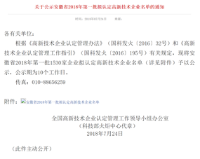 2018年7月24日,國家科技部全國高新技術(shù)企業(yè)認(rèn)定管理工作領(lǐng)導(dǎo)小組辦公室,通過科技部火炬中心官網(wǎng)發(fā)布——安徽省2018年第一批國家級(jí)高新技術(shù)企業(yè)認(rèn)定名單的公示通知,我公司安徽譽(yù)特雙節(jié)能技術(shù)有限公司榜上有名,目前已順利通過公示,正式予以認(rèn)定,公司在此表示熱烈祝賀!