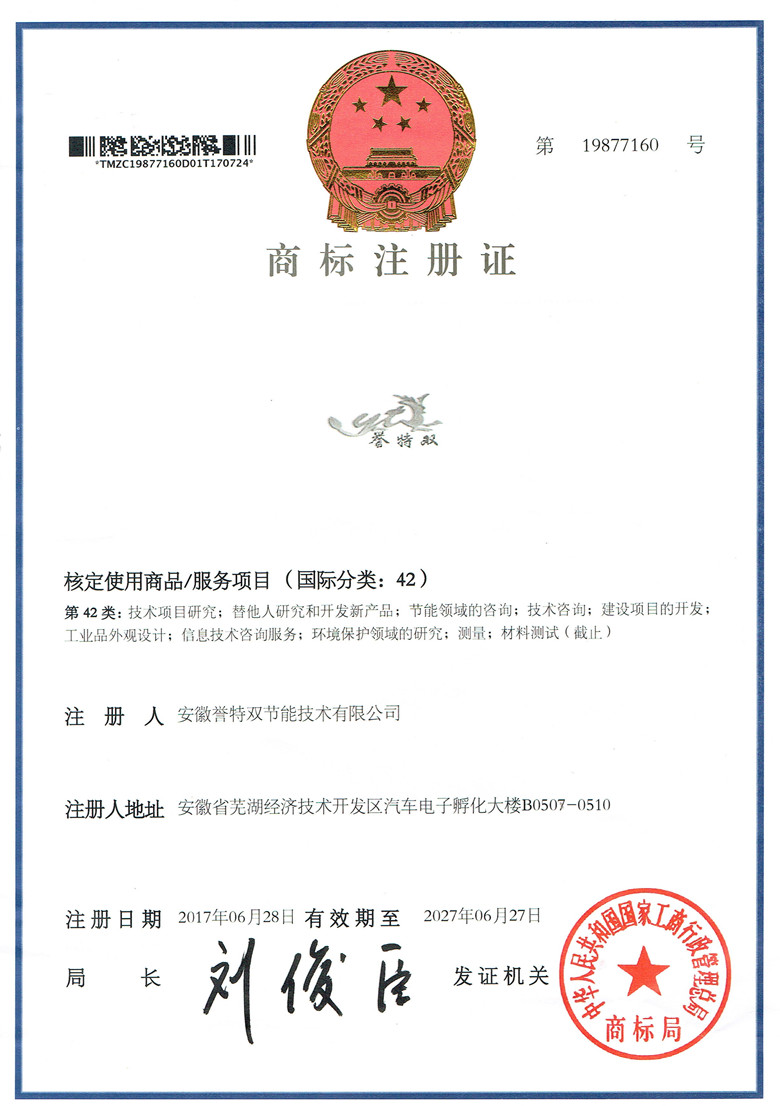 商標(biāo)是知識(shí)產(chǎn)權(quán)的重要組成部分,是企業(yè)的無(wú)形資產(chǎn),凝聚著生產(chǎn)者、經(jīng)營(yíng)者的智慧和勞動(dòng),體現(xiàn)著企業(yè)的經(jīng)營(yíng)成果。我公司申請(qǐng)的“譽(yù)特雙”商標(biāo)的成功注冊(cè),不僅使該標(biāo)志能夠得到國(guó)家強(qiáng)制力的保護(hù),而且對(duì)豐富企業(yè)品牌,維護(hù)企業(yè)名稱,擴(kuò)大企業(yè)影響,都將具有積極的意義;標(biāo)志著譽(yù)特雙在品牌建設(shè)方面取得了一個(gè)里程碑的勝利,勝利得之不易,我們會(huì)通過(guò)全體員工的不懈努力來(lái)維護(hù)譽(yù)特雙節(jié)能公司的信譽(yù),不斷提高客戶對(duì)我們品牌的認(rèn)可度,從而使商標(biāo)的價(jià)值不斷提升,為企業(yè)客戶提供更優(yōu)質(zhì)的節(jié)能服務(wù)。