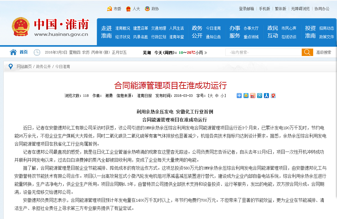 我公司以合同能源管理模式全額投資安徽德邦化工有限公司,替代減溫減壓裝置新上3MW余熱余壓綜合利用發(fā)電項目已成功運行數(shù)月,該項目的成功運行受到淮南市委、市政府、開發(fā)區(qū)管委會等主管部門的高度重視與評價,認為該項目的成功實施在淮南乃至整個安徽省地域具有現(xiàn)實的標桿示范意義。