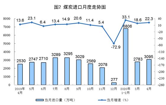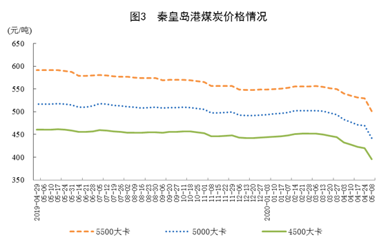 煤炭進(jìn)口增長(zhǎng)較快,交易價(jià)格有所下跌。4月份,進(jìn)口煤炭3095萬噸,同比增長(zhǎng)22.3%;1—4月份,進(jìn)口煤炭1.3億噸,同比增長(zhǎng)26.9%。港口煤炭綜合交易價(jià)格繼續(xù)下跌,5月8日秦皇島港5500、5000和4500大卡煤炭?jī)r(jià)格分別為每噸501元、442元和396元,比4月3日分別下跌39元、41元和36元。