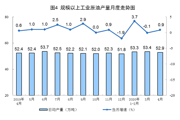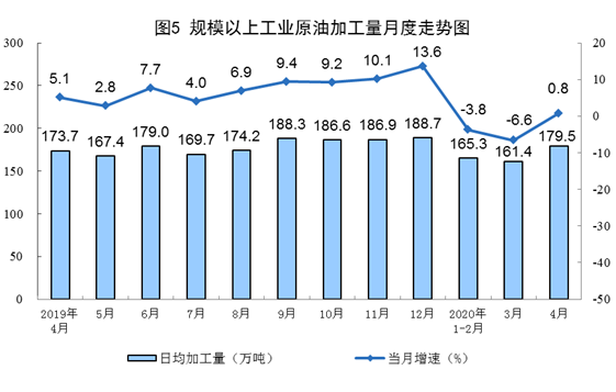 原油生產(chǎn)平穩(wěn),加工量由降轉(zhuǎn)增。4月份,生產(chǎn)原油1587萬噸,同比增長(zhǎng)0.9%,增速由負(fù)轉(zhuǎn)正,上月為下降0.1%,日均產(chǎn)量52.9萬噸;加工原油5385萬噸,同比增長(zhǎng)0.8%,上月為下降6.6%,日均加工179.5萬噸。1—4月份,生產(chǎn)原油6444萬噸,同比增長(zhǎng)2.0%;加工原油20348萬噸,同比下降3.4%。
