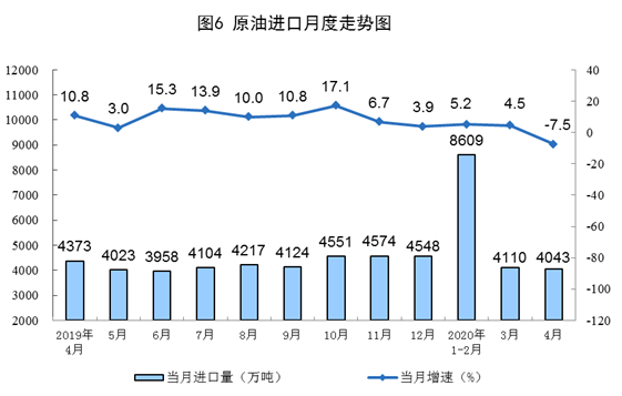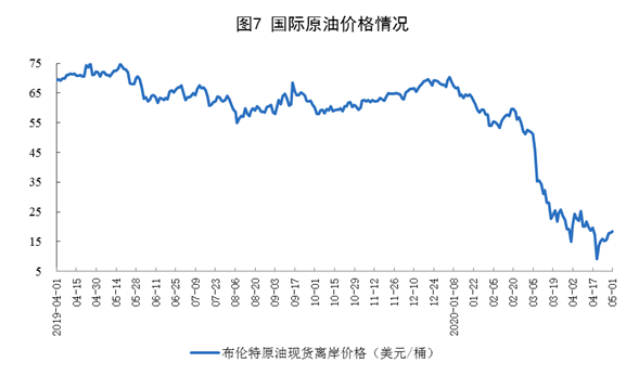 原油進(jìn)口下降,國(guó)際原油價(jià)格低位震蕩。4月份,進(jìn)口原油4043萬噸,同比下降7.5%。1—4月份,進(jìn)口原油16761萬噸,同比增長(zhǎng)1.7%。4月30日布倫特原油現(xiàn)貨離岸價(jià)格為18.11美元/桶,比3月31日的14.85美元/桶上漲22.0%。