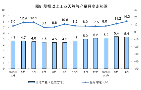 天然氣生產(chǎn)加快。4月份,生產(chǎn)天然氣161億立方米,同比增長(zhǎng)14.3%,增速比上月加快3.1個(gè)百分點(diǎn),日均產(chǎn)量5.4億立方米。1—4月份,生產(chǎn)天然氣644億立方米,同比增長(zhǎng)10.3%。