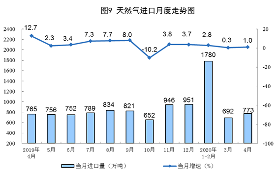 天然氣進(jìn)口小幅增長(zhǎng)。4月份,進(jìn)口天然氣773萬噸,同比增長(zhǎng)1.0%。1—4月份,進(jìn)口天然氣3233萬噸,同比增長(zhǎng)1.5%。