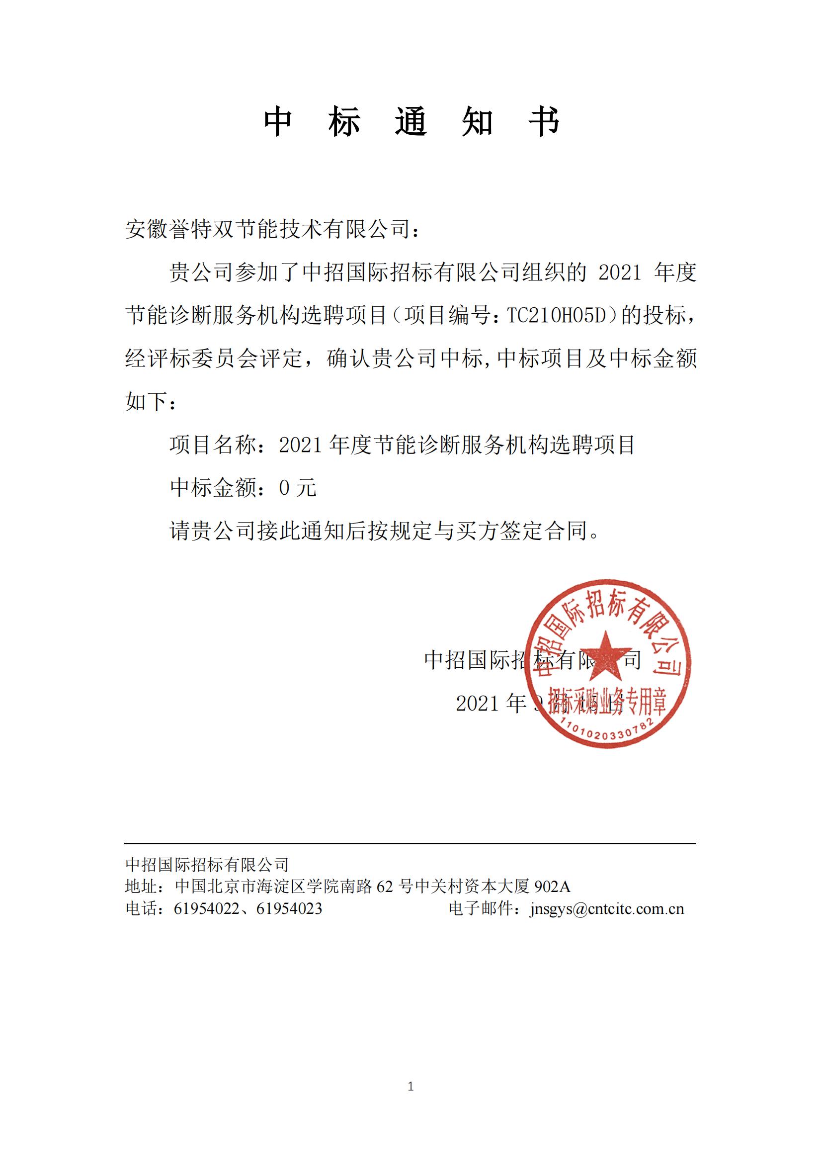 2021年國家工業(yè)節(jié)能診斷中標(biāo)通知書