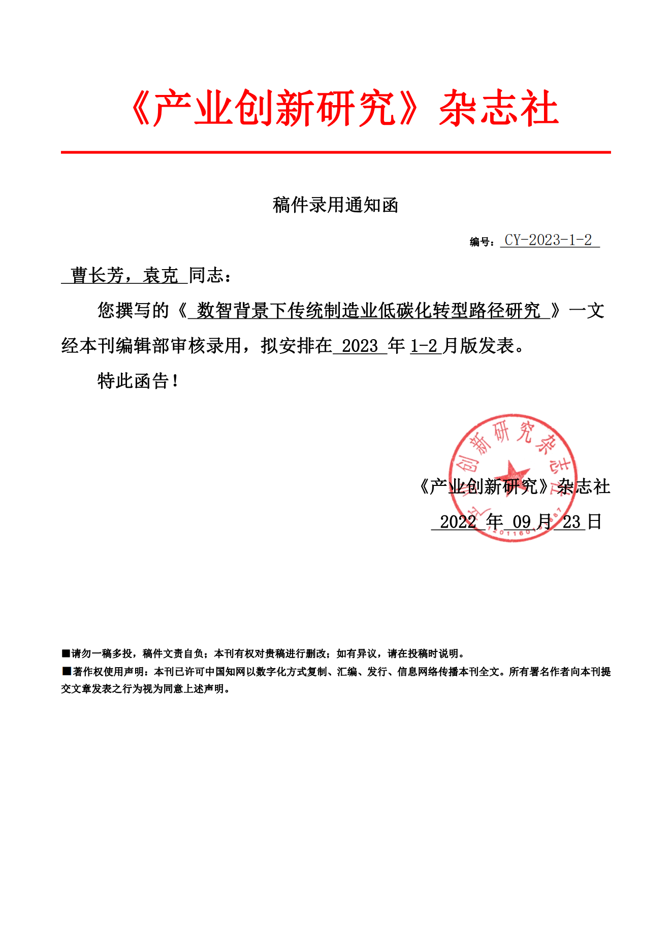 近日,我公司參與撰寫的專業(yè)學(xué)術(shù)論文《數(shù)智背景下傳統(tǒng)制造業(yè)低碳化轉(zhuǎn)型路徑研究》,經(jīng)國家新聞出版總署的部級期刊《產(chǎn)業(yè)創(chuàng)新研究》雜志社審核通過并予以錄用,擬安排在2023年1-2月版發(fā)表,在此表示熱烈祝賀。