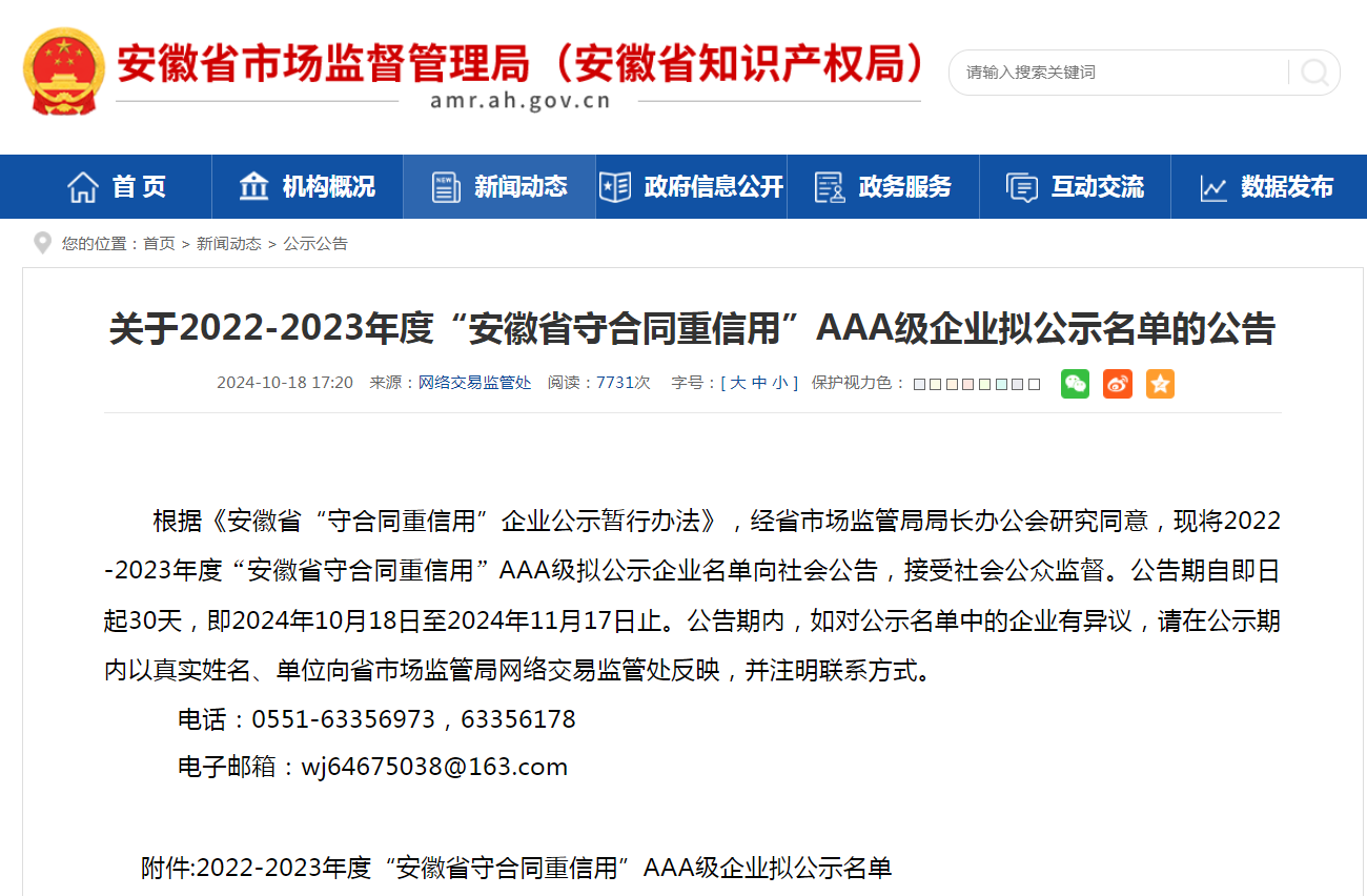 為推動(dòng)企業(yè)誠(chéng)信建設(shè)、賦能企業(yè)高質(zhì)量發(fā)展,安徽省市場(chǎng)監(jiān)督管理局經(jīng)統(tǒng)一部署,組織開(kāi)展了2024年度安徽省“守合同重信用”企業(yè)評(píng)選公示活動(dòng),通過(guò)對(duì)申報(bào)的企業(yè)進(jìn)行資料復(fù)核、征信查詢、合同執(zhí)行、業(yè)績(jī)數(shù)量、市場(chǎng)口碑、企業(yè)形象、行業(yè)影響等各方面進(jìn)行評(píng)估,經(jīng)嚴(yán)格的實(shí)地核實(shí)、綜合評(píng)判,遴選出一批行業(yè)影響力大、品牌信用度高的經(jīng)營(yíng)發(fā)展態(tài)勢(shì)良好的企業(yè),我公司榮幸被評(píng)選為安徽省2022-2023年度“守合同重信用AAA級(jí)企業(yè)”,省內(nèi)平均每個(gè)地級(jí)市全行業(yè)僅在30家左右,含金量非常高,在此表示熱烈祝賀!