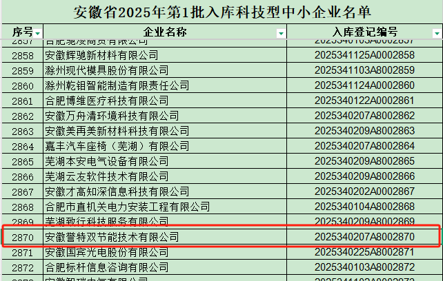 近日,安徽省科學(xué)技術(shù)廳公布了2025年第一批入庫科技型中小企業(yè)名單,安徽譽(yù)特雙節(jié)能技術(shù)有限公司憑借其在節(jié)能技術(shù)領(lǐng)域的突出創(chuàng)新實(shí)力和豐富的技術(shù)積累,入選科技型中小企業(yè)庫,成為安徽省科技創(chuàng)新主力軍中的一員。